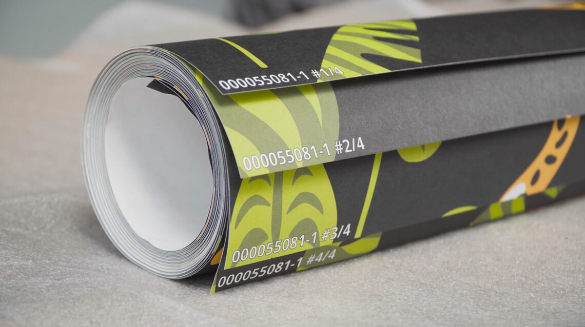 En la parte inferior de las tiras verás un código. Se trata de un código único para tu papel pintado. Estos números están impresos en la zona del margen de tu papel pintado fotográfico y los cortarás posteriormente de la tira cuando la hayas pegado. Detrás del código están los números de pista: este es el orden en el que debes colocar el papel pintado de izquierda a derecha.