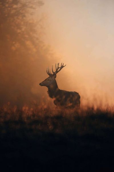 Ciervo rojo en un velo dorado de la mañana en diferentes materiales