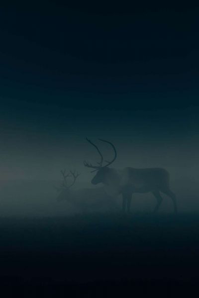Los estilos de color utilizados son predominantemente azul profundo, antracita y gris brumoso, con transiciones sutiles que crean una imagen total fluida y suave. El contraste entre el fondo difuso y la forma más clara de los ciervos en primer plano proporciona profundidad sin resultar abrumador, creando espacio y aliento en el diseño.