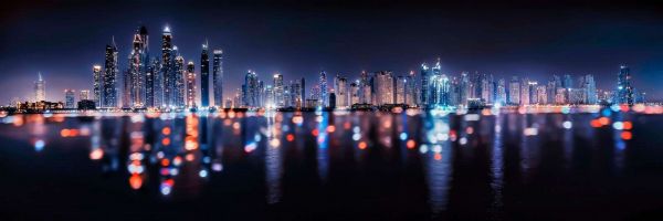 La combinación de colores consiste en tonos azul frío y morados, alternados con reflejos de luz cálida en naranja y rojo. Esta combinación aporta una sensación dinámica, enérgica y moderna. Las luces atenuadas en primer plano dan a la imagen un toque artístico, haciendo que parezca que miras la skyline a través de un objetivo de enfoque suave — esto refuerza el aspecto onírico, casi futurista.