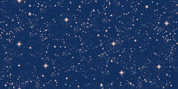 La paleta de colores —una base azul noche profunda con suaves estrellitas melocotón— crea un contraste armónico que añade calidez a un fondo frío. El patrón es detallado pero ligero, por lo que tampoco resulta abrumador en superficies amplias.