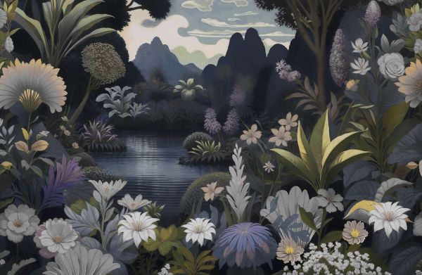 También, en un interior ecléctico o botánico, esta escena luce magníficamente. Piensa en materiales naturales como la madera y el ratán, combinados con telas ricas y plantas en diferentes alturas. Ideal para una sala de estar, dormitorio o incluso un elegante despacho donde se desee un ambiente calmante pero marcado. La combinación de paisaje y flores aporta profundidad, equilibrio y una experiencia casi de cuento de hadas.