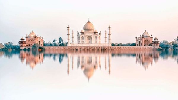 Esta imagen respira calma, precisión y belleza. La composición simétrica de la famosa estructura de mármol, flanqueada por dos pabellones de piedra roja, irradia un equilibrio casi espiritual. Los suaves tonos pastel del cielo y la reflexión en el agua cristalina refuerzan la sensación de atemporalidad. Cada elemento del edificio —desde la cúpula central hasta las cuatro minaretes esbeltos— está perfectamente spiegelado en la superficie del agua, creando una calma visual y profundidad que se siente tanto impresionante como meditativa.