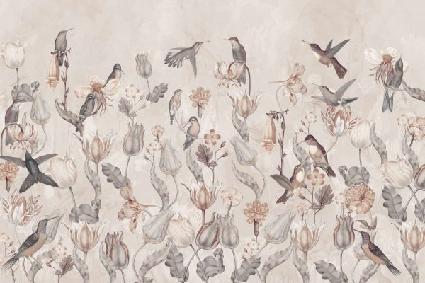 Papel Pintado - Sinfonía de Colibríes de Primavera - Flor Sepia Vintage