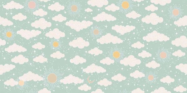 Combina este patrón con muebles en blanco, gris claro o madera natural. Tejidos suaves como muselina, algodón o lino en amarillo pastel, rosa empolvado o verde menta realzan el carácter onírico. Accesorios como lámparas con forma de nube, cojines con sol o móviles de estrellas encajan perfectamente con el tema y convierten el espacio en un lugar cariñoso y lleno de fantasía.
