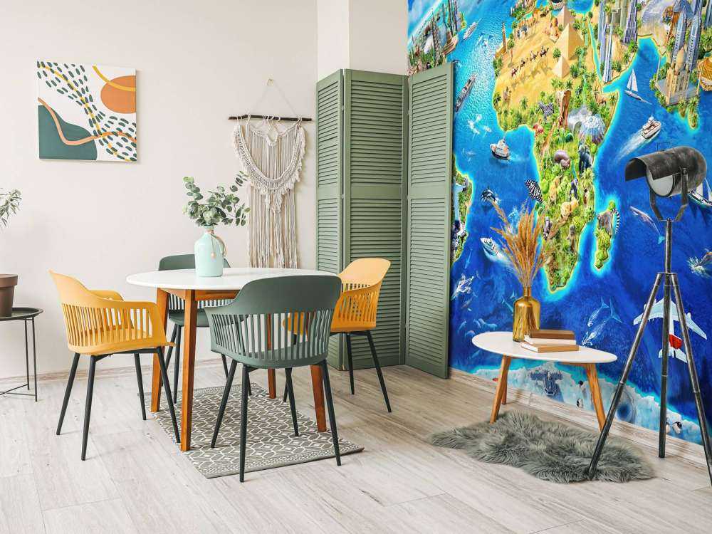 Este diseño encaja perfectamente en habitaciones infantiles, espacios educativos o oficinas donde se fomente la inspiración y la curiosidad. Combínalo con globos terráqueos, mapas del mundo o souvenirs de diferentes países para enriquecer el espacio con una atmósfera cosmopolita. Para un toque lúdico, se pueden añadir elementos de viaje como maletas vintage o brújulas decorativas. El diseño irradia asombro y conexión, e inspira a descubrir la hermosa diversidad de nuestro planeta. Es una elección perfecta para aventureros, viajeros del mundo y cualquiera que desee llevar un pedazo del mundo a su hogar.